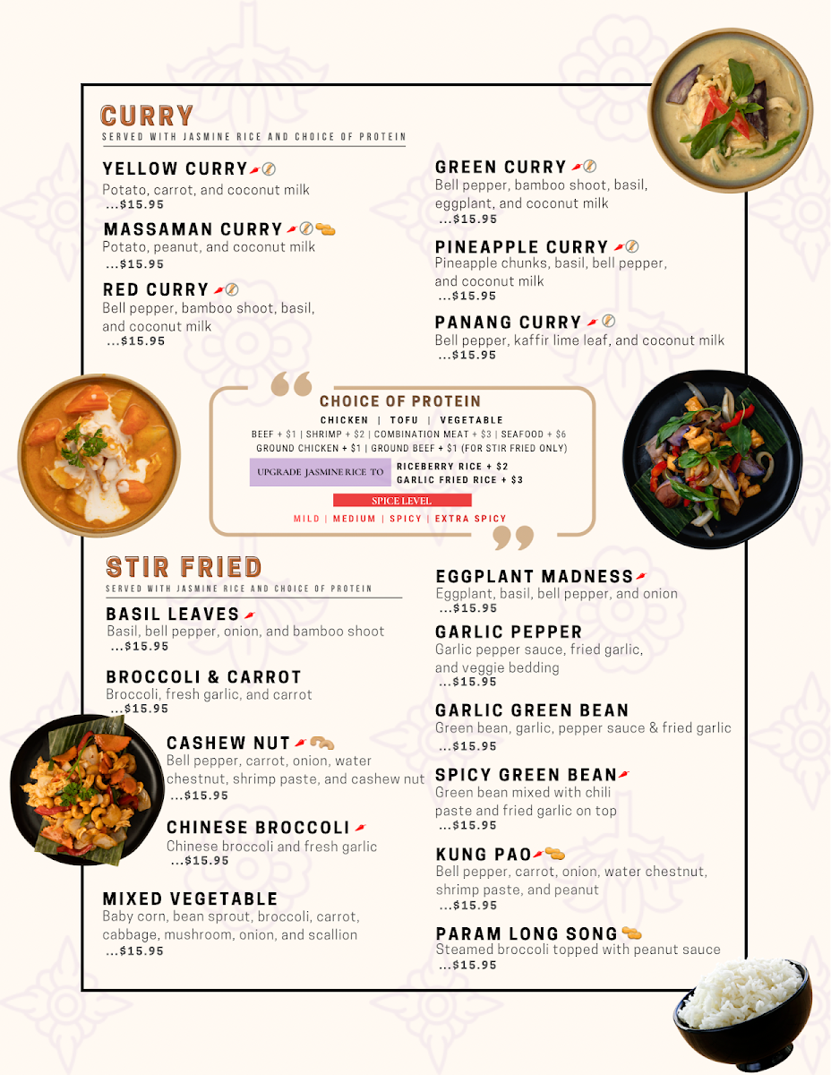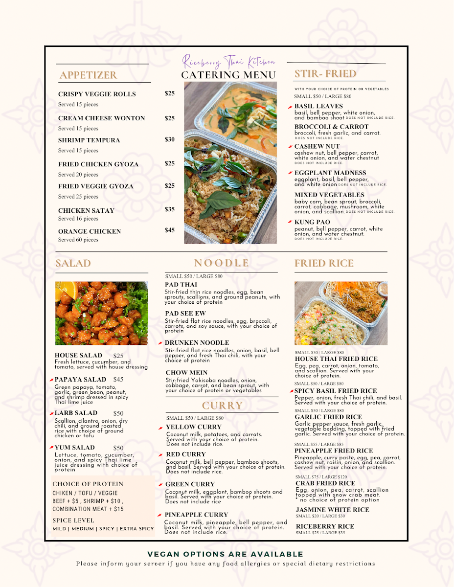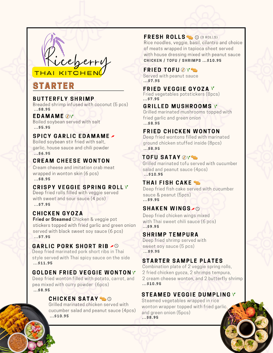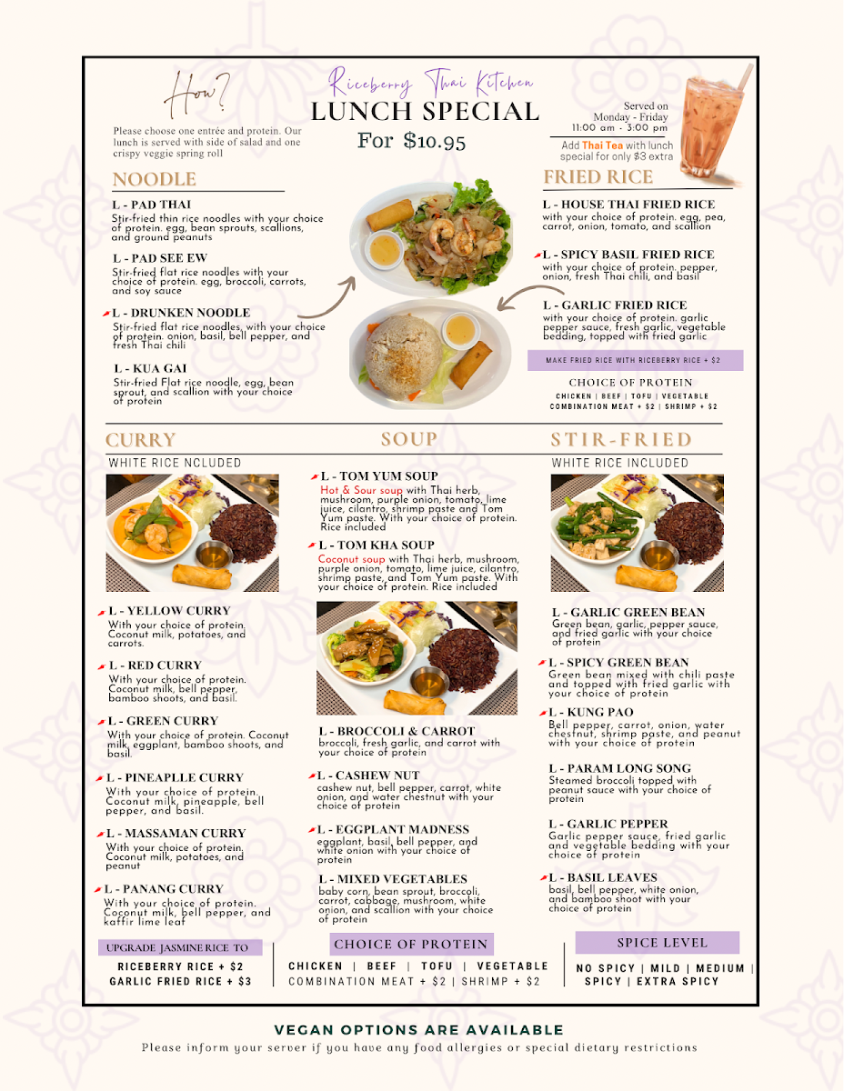 Riceberry Thai Kitchen offers an array of delicious dishes that boast a balance of sweet, sour, spicy, and salty flavors, capturing the essence of Thai cooking. Among their standout menu items, the Tom Yum Soup is a must-try—available in both small and large portions, it combines fragrant herbs with succulent shrimp or chicken for a spicy, tangy experience. For those who enjoy a creamy twist, the Tom Kha soup offers a velvety coconut base that pairs beautifully with vegetables or protein, delivering a comforting bowl that’s perfect for any day.