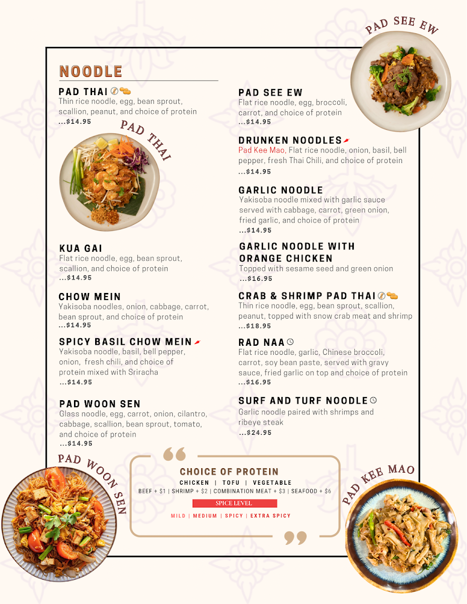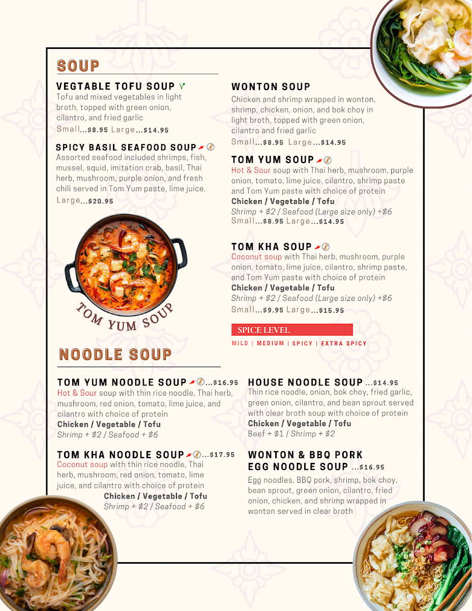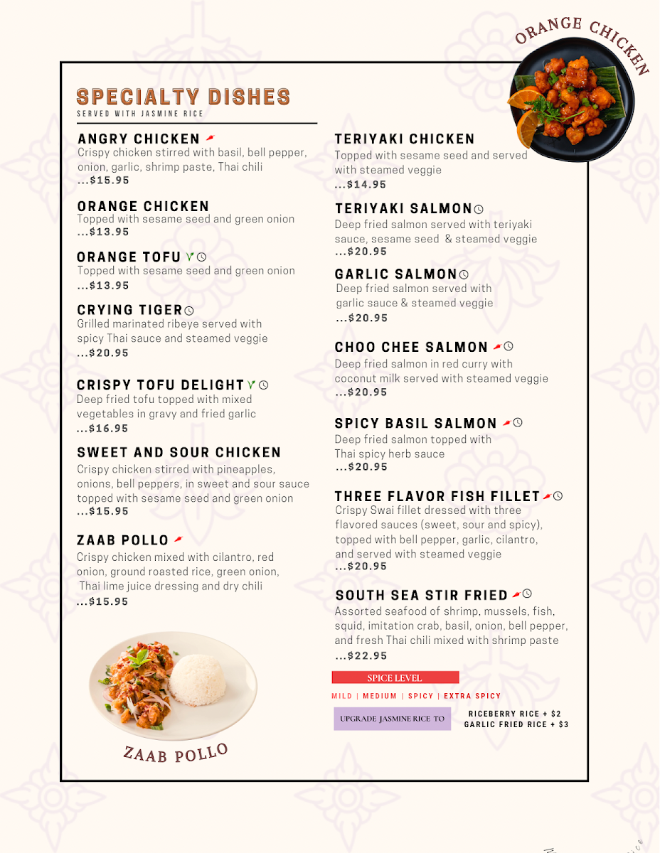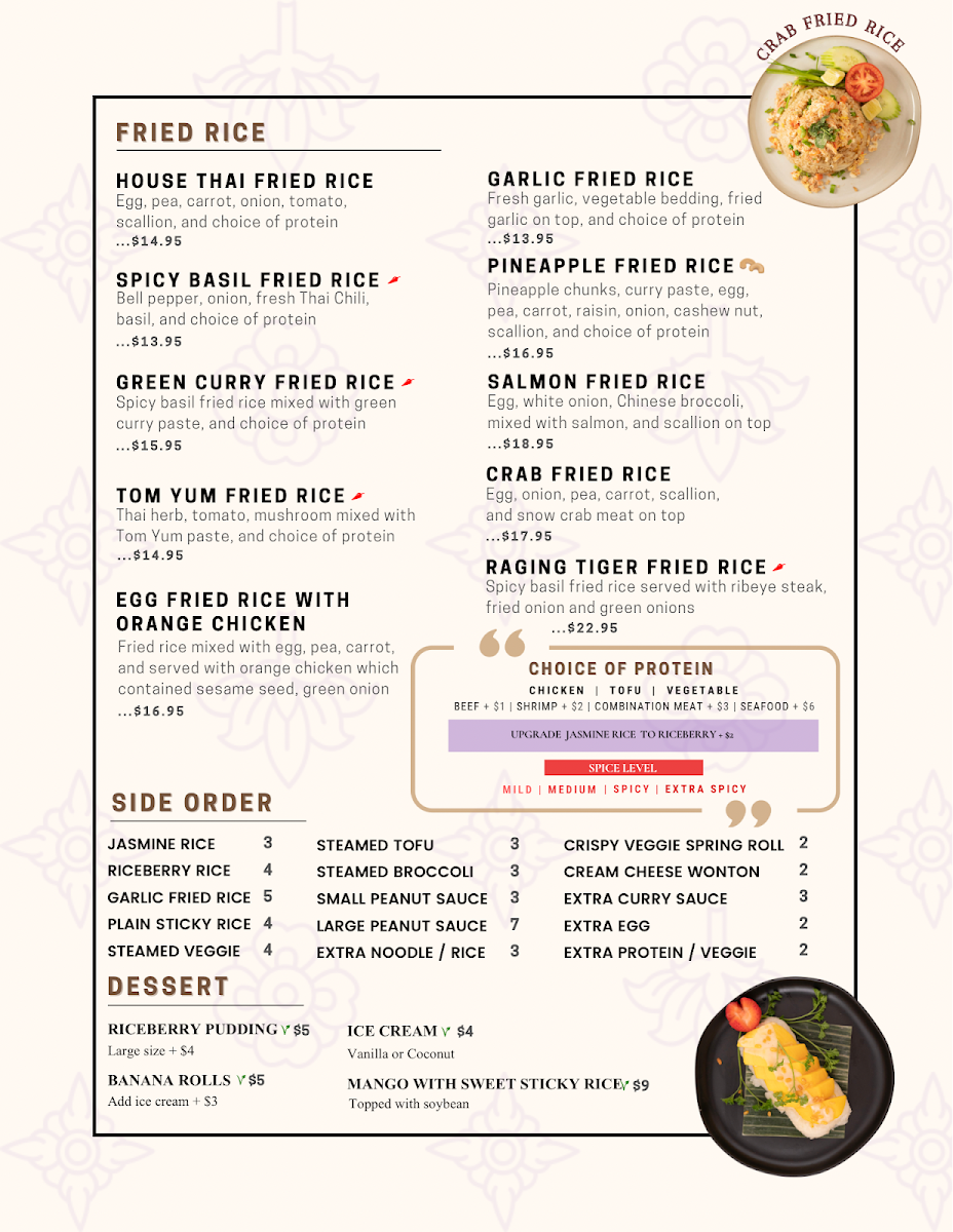 Riceberry Thai Kitchen offers an array of delicious dishes that boast a balance of sweet, sour, spicy, and salty flavors, capturing the essence of Thai cooking. Among their standout menu items, the Tom Yum Soup is a must-try—available in both small and large portions, it combines fragrant herbs with succulent shrimp or chicken for a spicy, tangy experience. For those who enjoy a creamy twist, the Tom Kha soup offers a velvety coconut base that pairs beautifully with vegetables or protein, delivering a comforting bowl that’s perfect for any day.