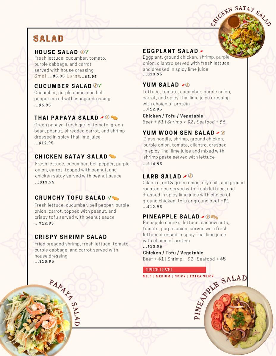 Step inside, and you’re greeted by a vibrant yet cozy atmosphere, perfect for a casual lunch or a dinner gathering with friends and family. The inviting decor, complete with traditional Thai elements, sets the stage for a memorable dining experience.